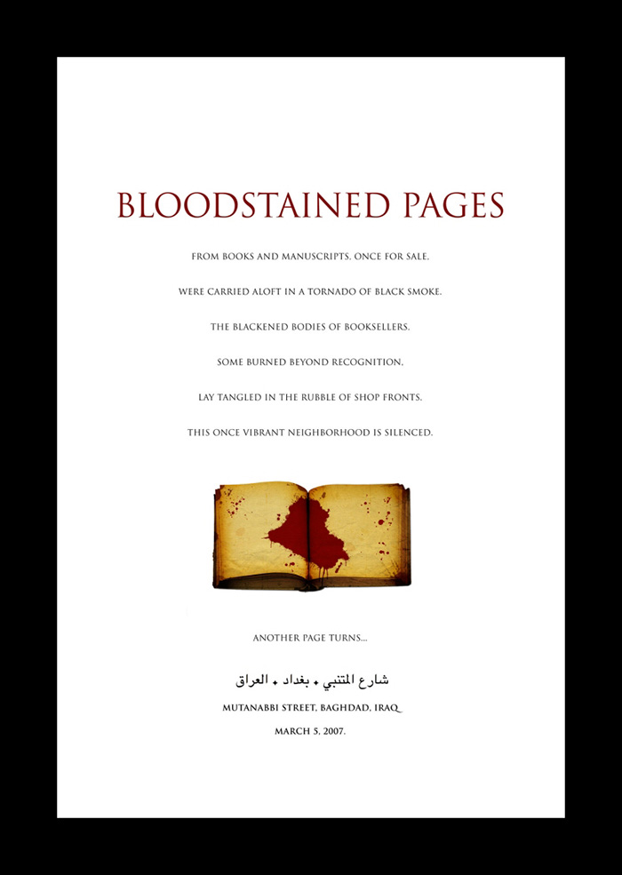 MutPoster Published September 20, 2014 at 700 × 985 in MutPoster Bloodstained Pages Broadside $50. Limited edition print for the Al-Mutanabbi Street Coalition. All profits go to Doctors Without Borders.